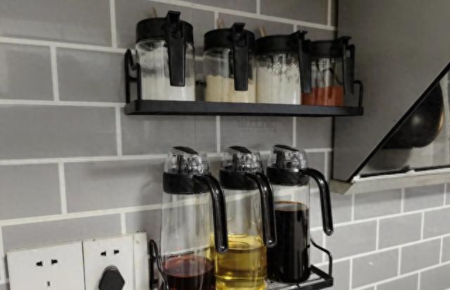 在灶台旁边的墙面上,安装一个收纳架,把油盐酱醋的调味瓶都放上去,不用摆在台面上占据台面空间,而且这样炒菜加料的时候,就可以顺手拿到调味瓶了。