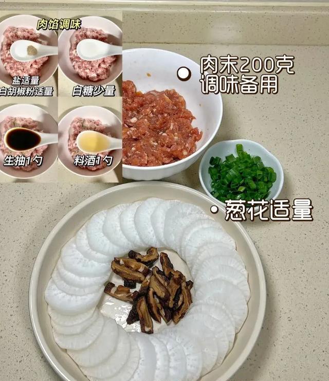 食材:白萝卜、干香菇、肉馅、葱花~