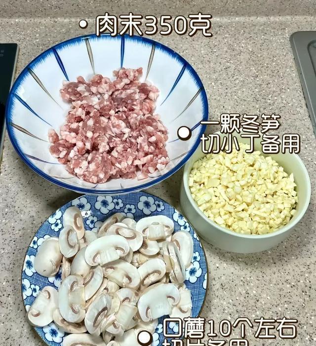 食材:肉沫、冬笋、口蘑~