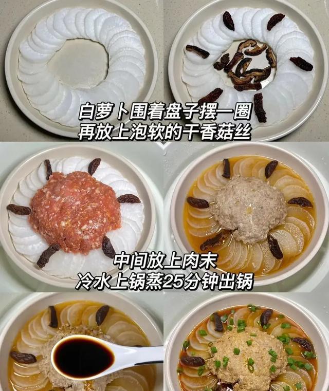 盘底铺上萝卜摆一圈,放香菇丝,中间放肉馅,冷水上锅蒸25分钟出锅,出锅后发一勺生抽,撒上葱花即可~