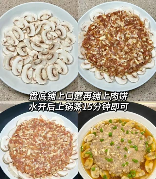 盘底铺上口蘑,铺上肉饼,水开上锅蒸15分钟即可~