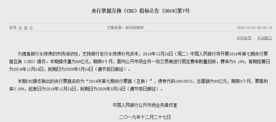 央行今日将开展60亿元央行票据互换(CBS)操作